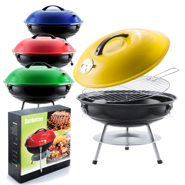 Barbacoa en resistente acero con base en color negra y tapa en vivos colores. Tapa con cómoda asa y orificios de ventilación, parrilla metálica, plato antigoteo y pies antideslizantes. Presentada en atractiva caja de diseño.