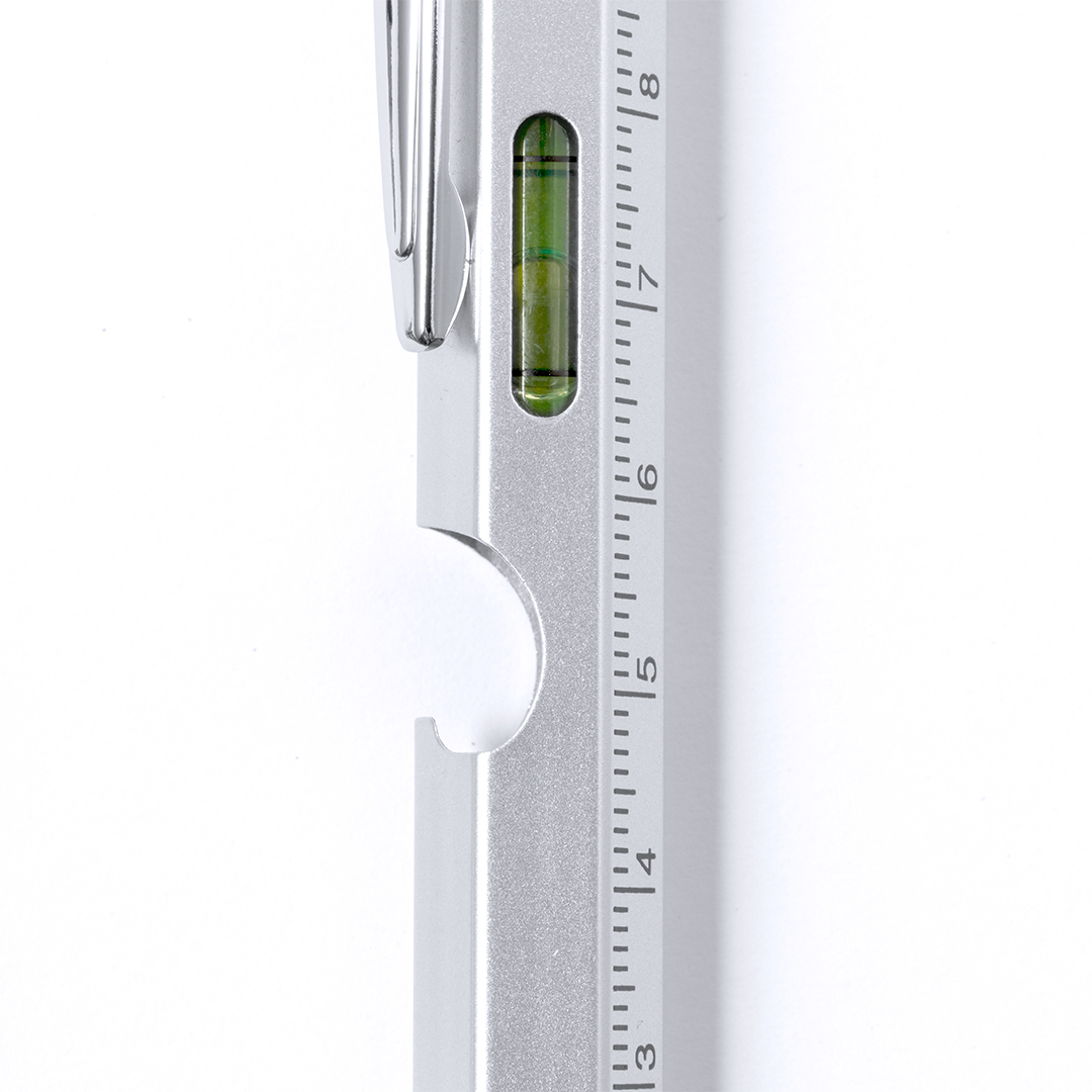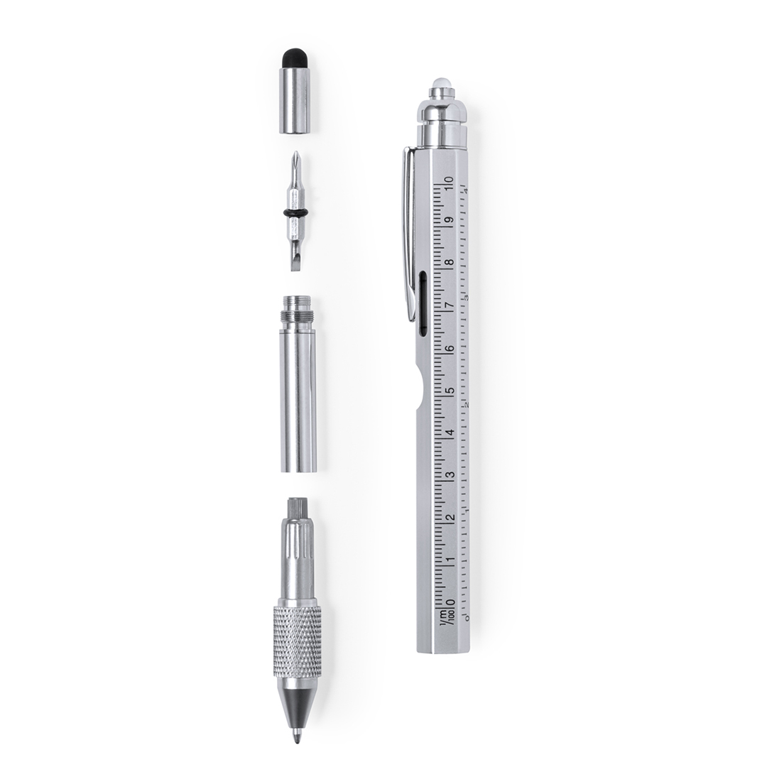 Bolígrafo multifunción 8 en 1 de mecanismo giratorio, fabricado en acero inox. Incluye regla en cm y pulgadas, nivel, abridor, 1 LED alimentado por pila de botón (incluida), puntero, punta plana y philips. Con clip metálico y tinta azul. Presentado individualmente en caja de diseño kraft. 1 Accesorio. 8 Funciones