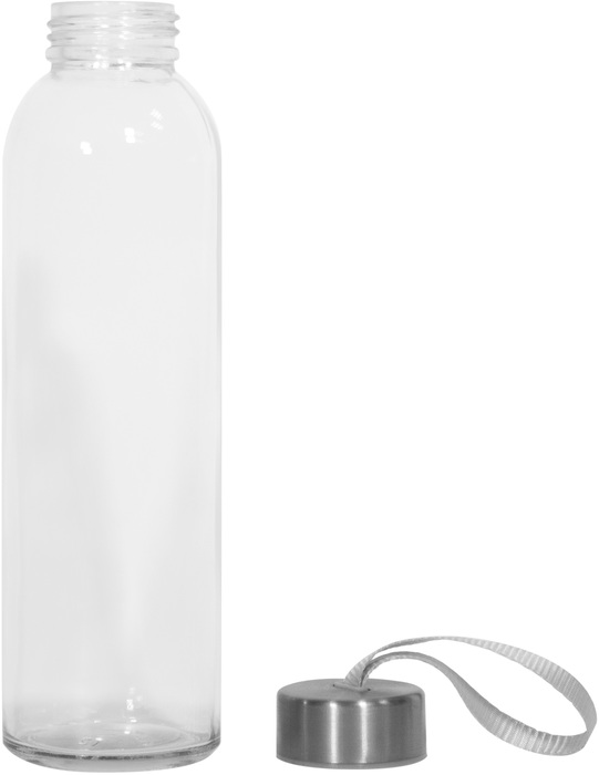 Ø 6,2 x 23 cm. Capacidad 500 ml. Vidrio resistente. Cuerpo traslúcido con tapa de acero inoxidable y tira color gris que permite transportarla. Presentación en caja de regalo.