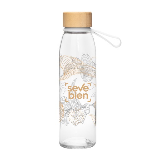Un básico con estilo propio.Botella de vidrio. Tapa de bambú, polipropileno y anillo de silicona antiderrame. Correa de silicona de diferentes colores.Medidas: Ø 6,4 x 22,8 cm.