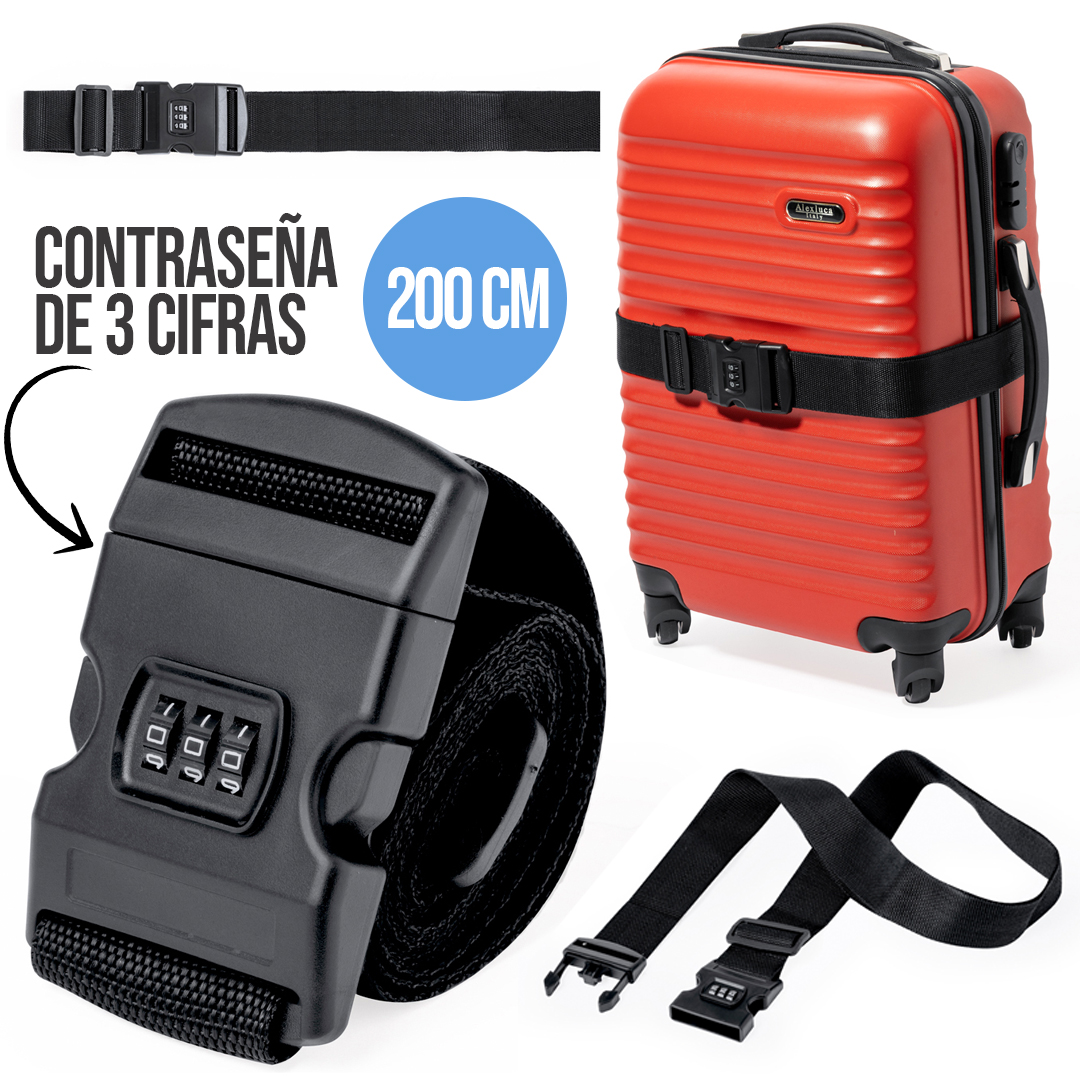 Cinta para maletas ajustable fabricada en resistente poliéster. Con cierre de hebilla ajustable y contraseña de 3 cifras. En discreto color negro y de 200cm de largo. Presentada en una bolsa individual de papel reciclado. Cierre Seguridad