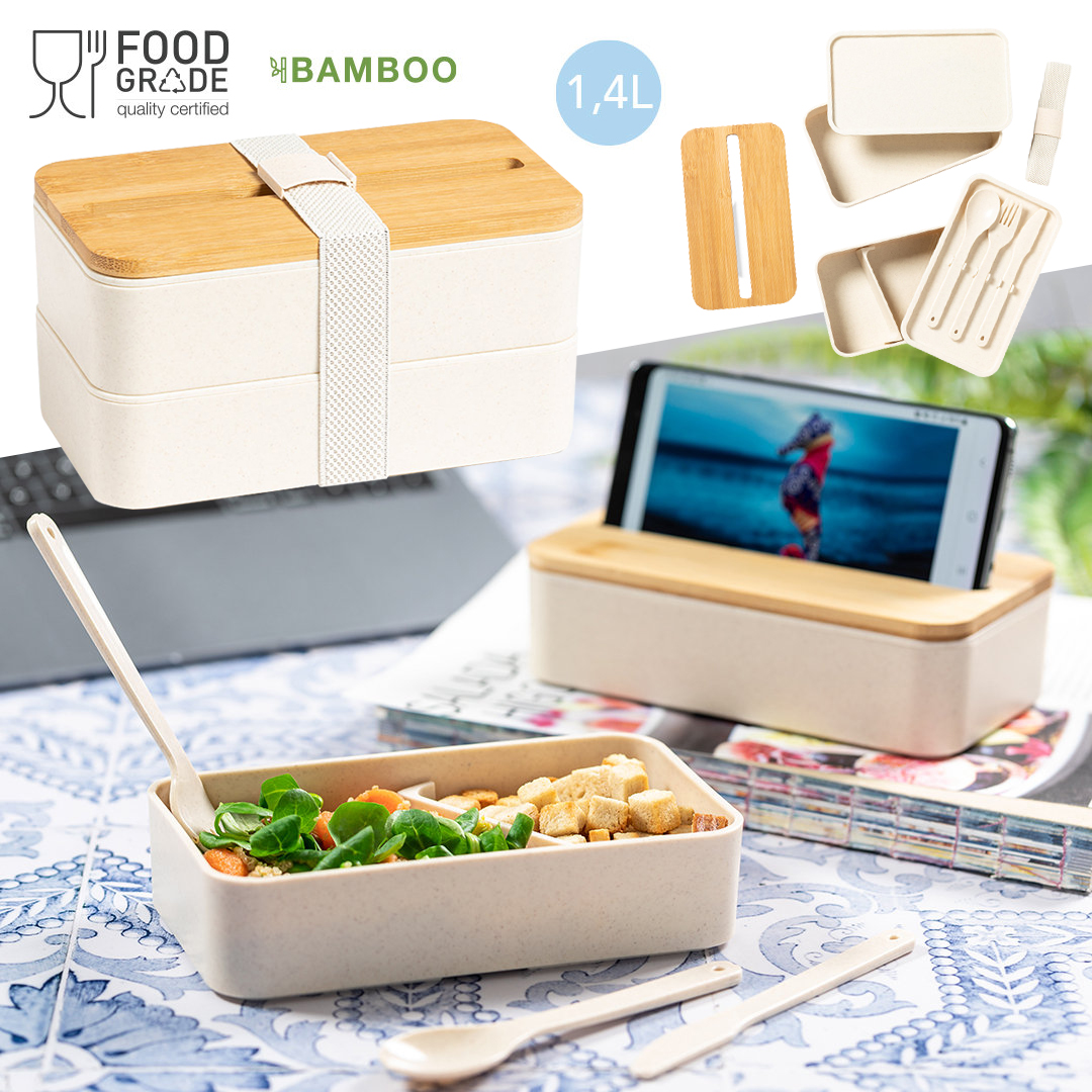 Original set de fiambreras de 1,4l en resistente material PP veteado libre de BPA. Original tapa de bambú con soporte para smartphone integrado. Dos compartimentos, cada uno de 700 ml de capacidad y compartimento interior con tenedor, cuchara y cuchillo. Incluye cinta de seguridad exterior. Certificación Food Grade, garantizando la seguridad cuando los alimentos entran en contacto con el material usado para fabricar el producto. 2 Compartimentos 700 ml