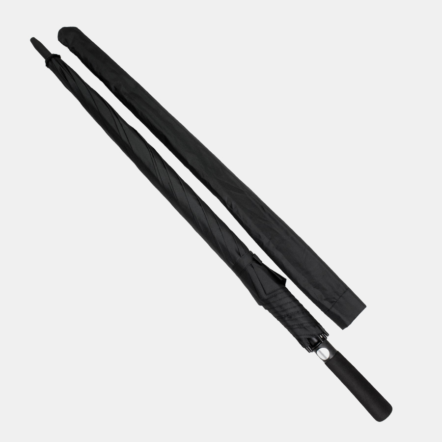 Paraguas ejecutivo gigante, con 8 cascos de tela 190T PONGEE, reverso UV. Contiene varas reforzadas Anti-Vuelco de Fibra de Vidrio color negro y sistema de apertura automático. Mango recto de EVA negro. Incluye funda al tono de 190T PONGEE.