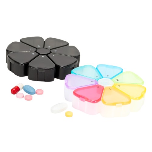 Pastillero Plástico de PVC "FLOWER" con forma de flor, con 7 compartimentos triangulares de diferentes colores translúcidos, identificados y ordenados con las iniciales de los 7 días de la semana. Presentación el bolsa blanca biodegradable + caja de cartulina blanca.