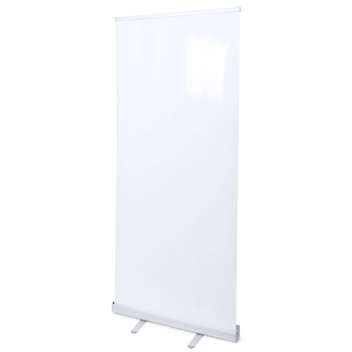 Panel de impresión roll up de 85x200cm en resistente polipropileno de alta densidad especialmente diseñado para marcaje a todo color. Con soportes de aluminio y gancho de sujeción. Presentación enrollado en funda de tela. Funda Poliéster