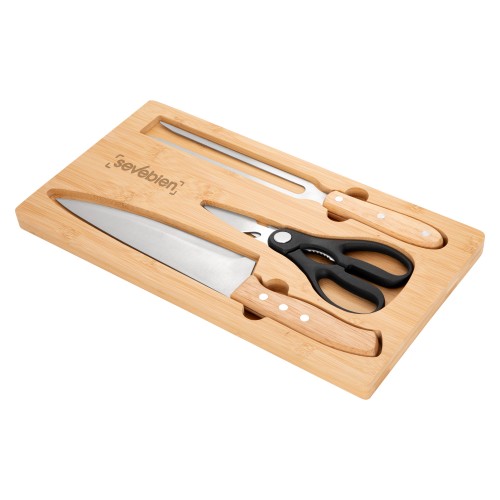 El detalle que se luce en cada asadoSet de asado. Tabla de corte de bambú con imán en el lado opuesto para fijar los 3 utensilios: Tijera de cocina multiuso (corte de aves, pescados, vegetales, y hierbas con abridor de botellas y rompenueces) de acero con mango plástico; Cuchillo chef y Tenedor, ambos de acero con mango de madera. Medidas: 19,5 x 8,5 cm. (tijera), 33,5 x 4,5 cm. (cuchillo) y 30,5 x 3 cm. (tenedor)