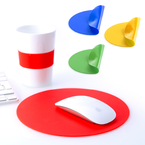 Alfombrilla de silicona de alta calidad, de diseño circular con cuerpo en vivos colores y base antideslizante. Presentada en atractiva bolsa de diseño con refuerzo de cartón. Antideslizante