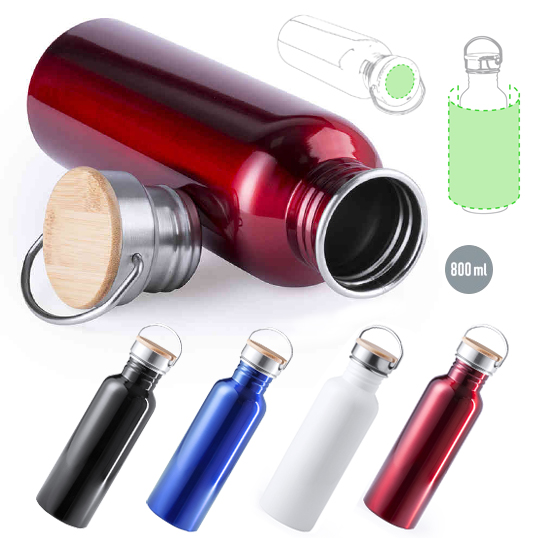 Bidón de estilo retro y 800ml de capacidad. Cuerpo en acero inox y en variada gama de colores brillantes. Tapón de seguridad a rosca en acero inox, con detalle en madera y asa de transporte vintage. Presentado en una atractiva caja de diseño. 800 ml
