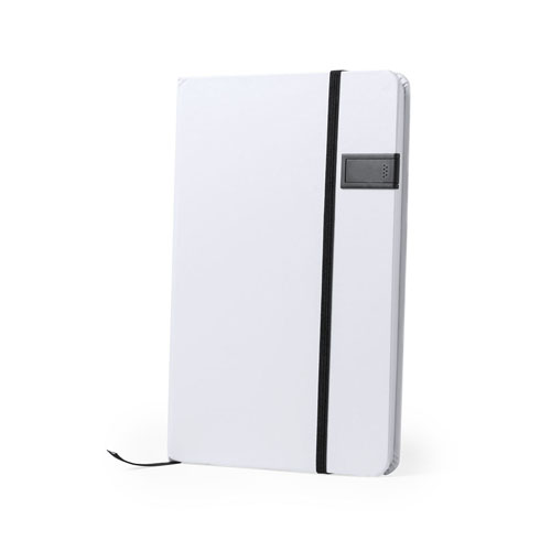 Bloc de notas de elegante acabado en color blanco, con memoria USB de 16GB de capacidad integrada en la tapa frontal. Cinta elástica, memoria USB y marcapáginas a juego, en variada gama de colores. Incluye 100 hojas con disposición a una raya. Portada Rígida. 100 Hojas. Memoria USB 16GB Incluida