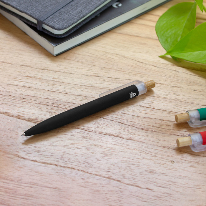 Bolígrafo retráctil. Cuerpo de alumio en diferentes colores acabado mate. Botón pulsador de bambú. Clip plástico transparente con terminación frosty.