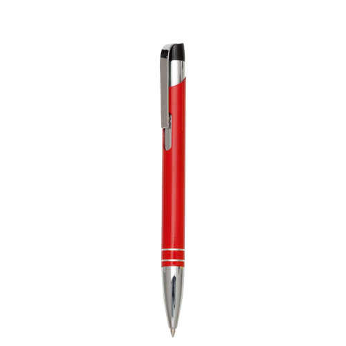 Original bolígrafo de mecanismo pulsador en elegante diseño bicolor. Con cuerpo troquelado en aluminio de suave acabado en variados colores. Original clip curvado, anillas y punta en plateado. De cartucho jumbo y tinta azul. Carga Jumbo