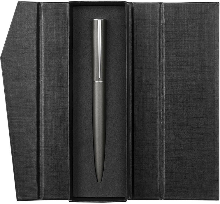 Metálico. Cuerpo color mate. Clip y anillo de acero. Apertura giratoria. Parte superior destapa acero. Parte inferior destapa dorado. Estuche de cartón. Tinta negra. Presentación en estuche con cierre magnético.