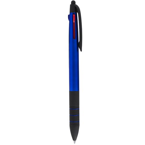 Bolígrafo puntero 3 en 1 de mecanismo pulsador retráctil, de actual diseño y cuerpo de suave acabado metalizado en vivos colores. Con accesorios en negro y suave empuñadura ergonómica en color negro con anillas a juego. De 3 cartuchos en tintas azul, roja y negra. Escritura 3 Colores