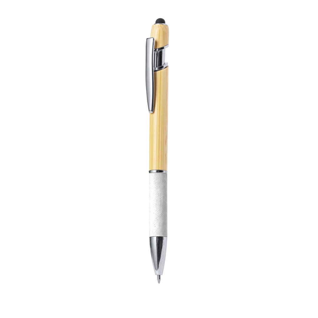 Bolígrafo puntero con cuerpo en bambú y papel reciclado. Caña fabricada en suave bambú con empuñadura hecha en cartón reciclado con textura y en variados colores. En la parte superior tiene un puntero negro. Clip metálico y accesorios en cromado. De mecanismo pulsador y en tinta azul. Elaborado con elementos vegetales para así fomentar la utilización de materias primas naturales y reducir las emisiones contaminantes.