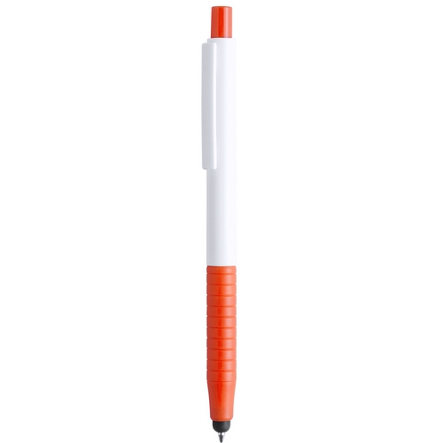 Bolígrafo puntero de mecanismo pulsador en desenfadado diseño bicolor y con suave empuñadura. Acabado liso especialmente diseñado para marcaje en tampografía y tinta azul.