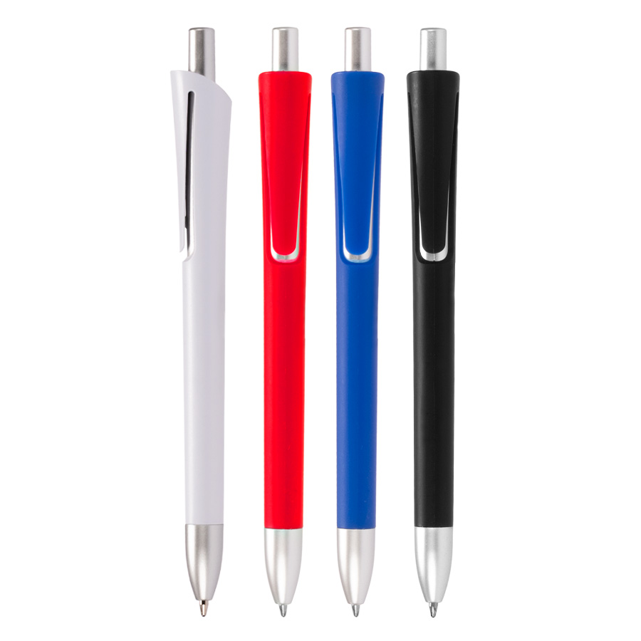 Bolígrafo plástico con cuerpo de color mate y terminales plateados. Escritura azul.