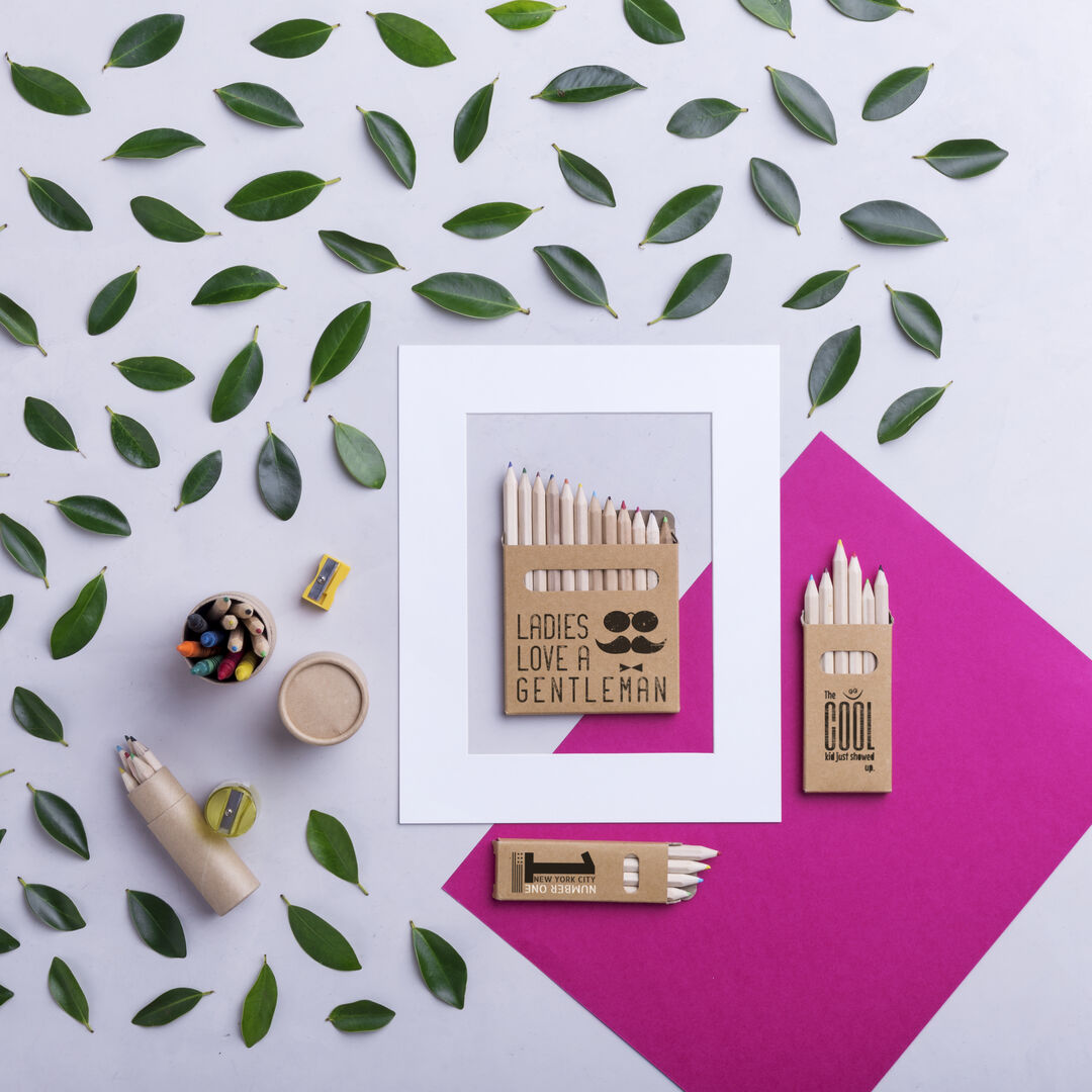 Set de 12 lápices en caja de cartón natural con ventana. Lápices de madera con cuerpo hexagonal de acabado natural y minas en variada gama de colores. 12 Lápices