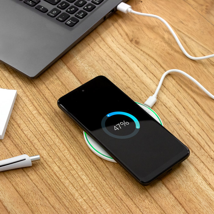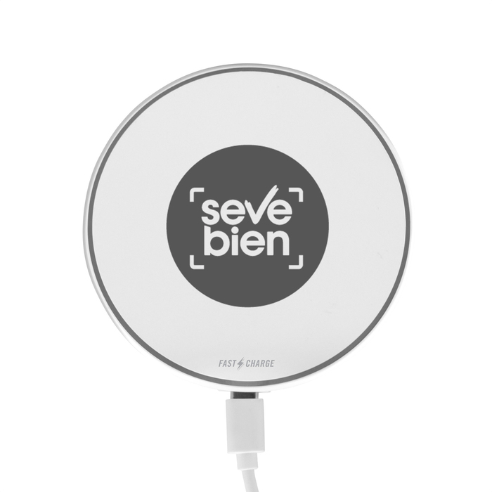 Ø 9,7 x 0,9 cm. Plástico ABS. Cargador inalámbrico con luz. Base plástica color blanco con antideslizantes. CARGA RÁPIDA. Salida: 15 watts. Luces indicadoras de carga. Cable de carga USB-C en color blanco de 50 cm de largo. Presentación en caja de regalo kraft.