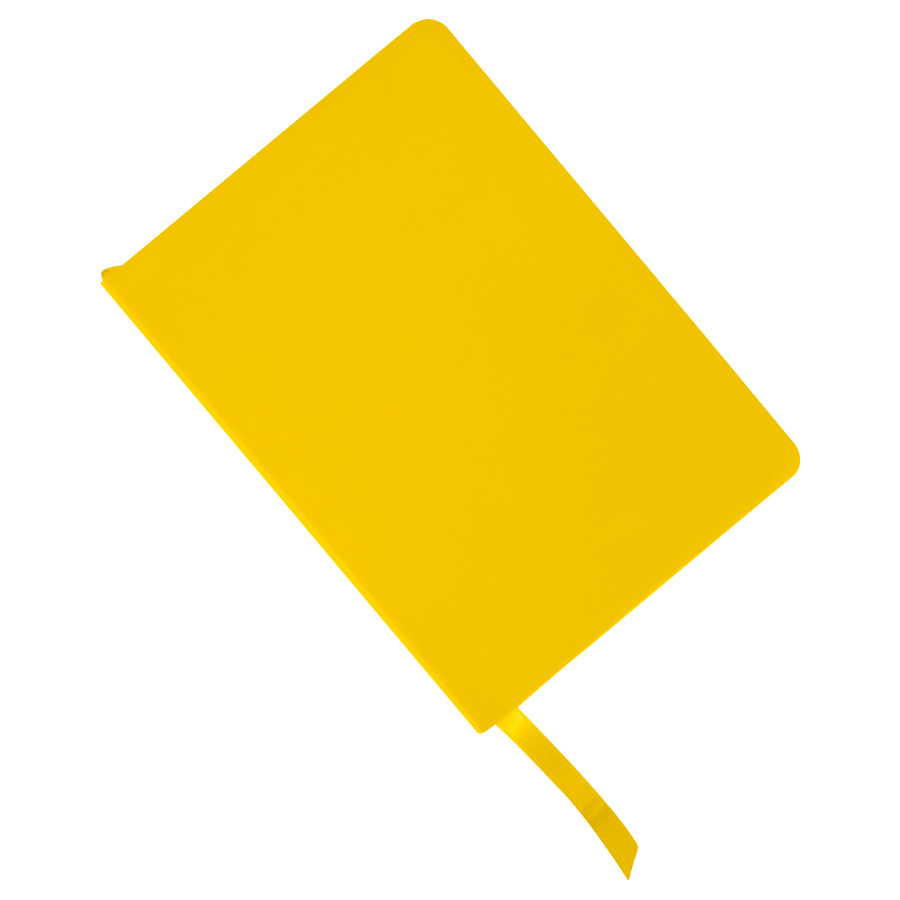 Cuaderno tamaño A5, con cubierta de PU eco-cuero de 2mm de espesor y lomo pintado de color al tono. Interior 80 hojas lineadas amarillas de 80gsm. Incluye banda separador de hojas al tono. Presentación individual en bolsa de polipropileno.