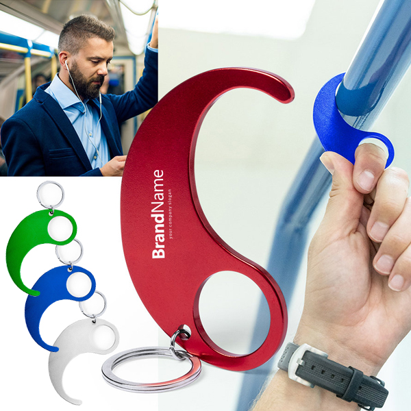 Llavero higiénico anti-contacto, fabricado en resistente Aluminio. El único llavero diseñado especialmente para uso en transporte público y evitar tocar con las manos superficies de uso común (manivelas de puertas, interruptores, grifos de uso público, cajeros automáticos...). Dispone de amplia zona de marcaje y cómodo troquel para el dedo. Acabado en aluminio en vivos y variados colores. Presentado en bolsita de diseño individual.