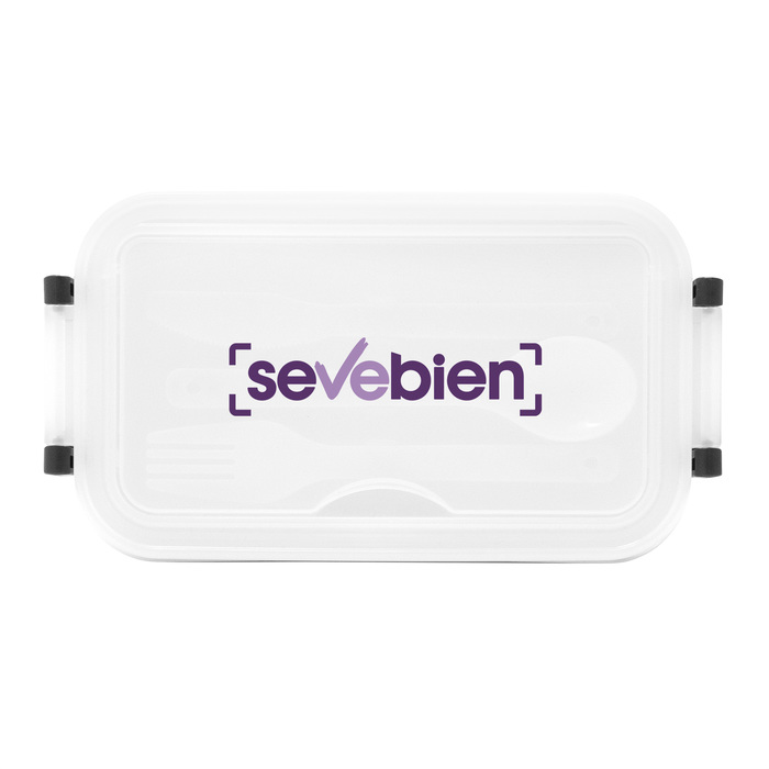 11,5 x 5,8 x 21,5 cm. Plástico PP. Contenedor de alimentos. Tapa translúcida con bandeja porta cubiertos, anillo de silicona antiderrame y ajustes de seguridad en sus laterales. Set de 3 cubiertos plásticos de color blanco (tenedor, cuchillo, cuchara) de 15 cm de largo.