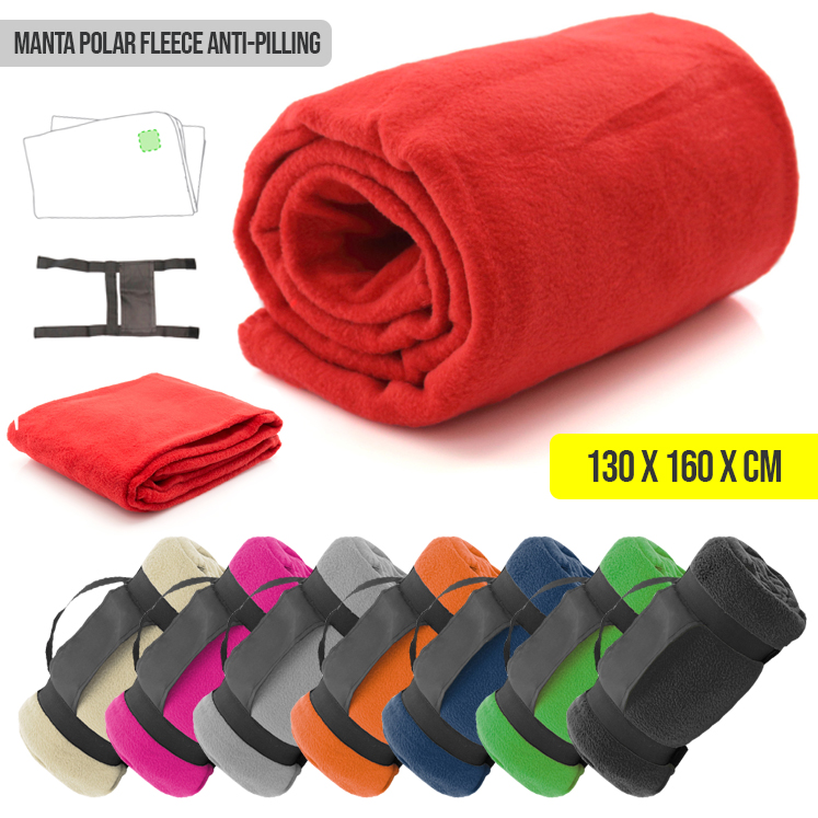 Manta de 130x160cm en variada gama de vivos colores. En material polar fleece anti-pilling de 200g/m2 y con asa de transporte de cierre de velcro en suave poliéster. Anti-Pilling