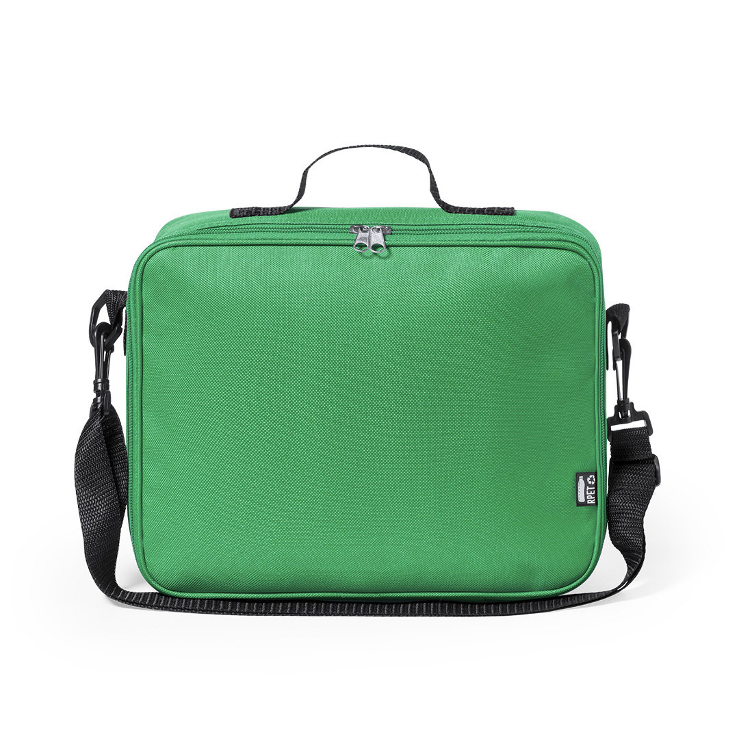 Nevera para niño de línea nature y en resistente 600D RPET, elaborado a partir de plástico reciclado para así fomentar la reutilización de residuos plásticos y contribuir a la sostenibilidad del planeta. Detalles en negro y base reforzada. Compartimento principal con cierre de cremallera e interior isotermo en aluminio. Incluye cinta bandolera ajustable y asa de transporte reforzada. Con distintivo RPET en etiqueta exterior y disponible en variada gama de colores.