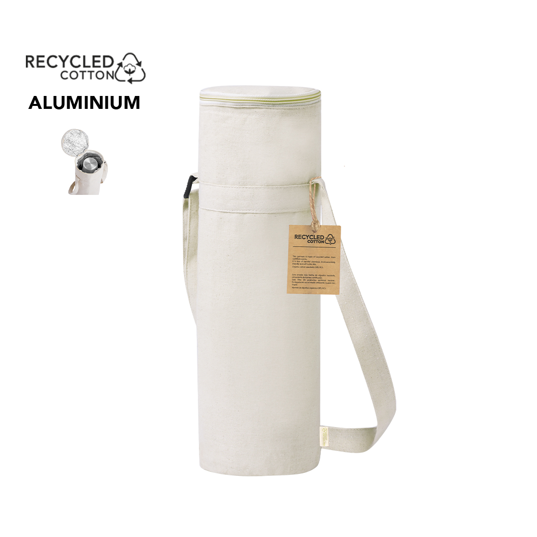 Bolsa térmica diseñada para transportar botellas de hasta 1,5L, confeccionada en algodón 100% reciclado. Se cierra mediante una cremallera y se lleva cómodamente con la cinta para el hombro ajustable, en tono natural. El interior está forrado con material isotérmico de aluminio y cuenta con una etiqueta distintiva. Presentado individualmente en bolsa reciclada.