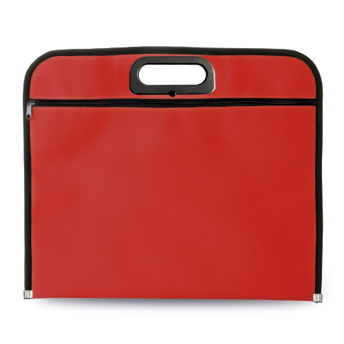 Portadocumentos de cierre de cremallera en suave acabado de poliéster 600D de vivos colores. Con asas de transporte de original diseño troquelado con refuerzo y ribetes en color negro con chapa metálica de refuerzo en la base.