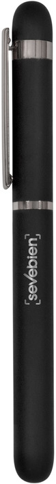 Metal. Cuerpo de aluminio. Roller. Apertura con tapa a presión. Clip y anillos metálicos color plata. Tinta Negra. Decapa color plata tanto en el cuerpo como en la tapa. Presentación en estuche con cierre magnético.