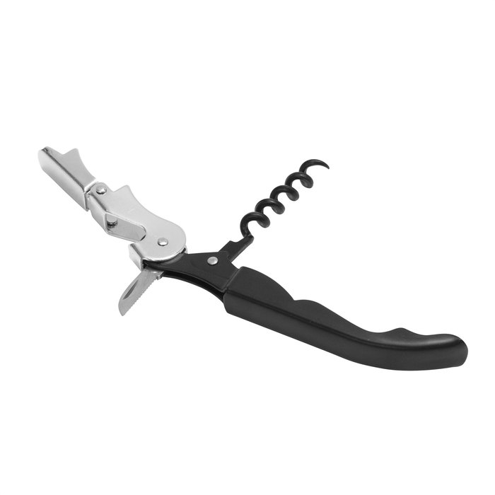 Ø 7,4 x 20 cm. Capacidad 350 ml. cada copa. Vidrio + Acero inoxidable. Set de 2 copas para vino y sacacorchos. Abridor de botellas en acero inoxidable 430 + acero cromado con acabado negro mate. Incluye espuma protectora donde encajan las piezas para su guardado y traslado. Presentación en caja de regalo kraft.