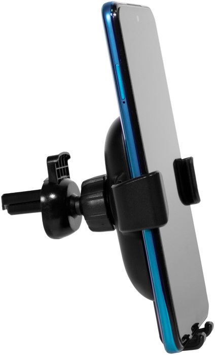 11,2 x 5,5 x 8,2 (largo). Plástico ABS. Soporte para celular con botón en la parte trasera. Mediante una leve presión se engancha en la ventilación del aire acondicionado del auto. El celular se apoya sobre 3 brazos que se ajustan para obtener una buena sujeción. En el centro cuenta con un circulo y con el simple contacto del celular comienza a cargar de manera inalámbrica la bateria. En la parte inferior tiene una entrada mini USB que permite darle carga al holder. Voltaje de entrada: 15W. Voltaje de salida: 10 W. Viene con cable cargador. Presentación en caja de regalo.