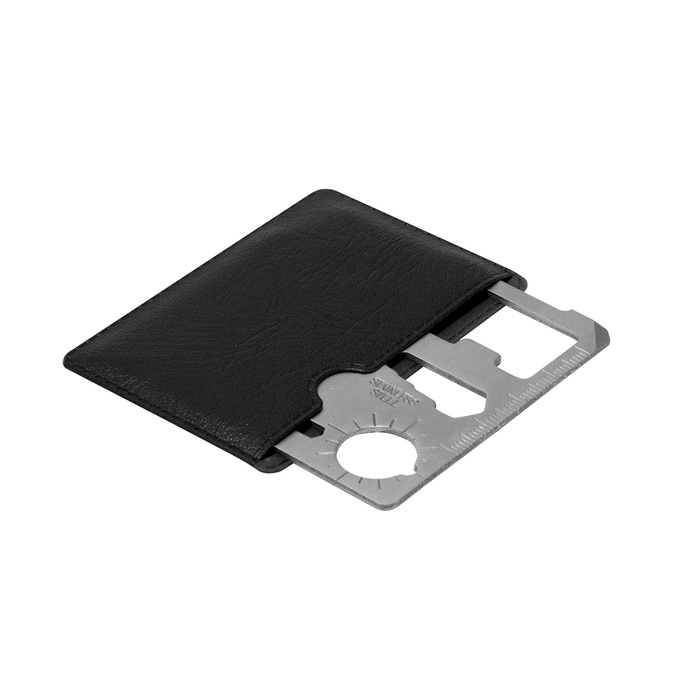 Tarjeta multiherramienta de supervivencia portátil. Concentra 11 funciones en 1: abrelatas, cuchillo, destornillador plano, regla, abridor de botellas, llave inglesa de 4 posiciones, llave mariposa, llave inglesa de 2 posiciones, calibre de ángulos / indicador auxiliar de dirección para navegación / brújula auxiliar, sierra y orificio para cordón o llavero. Incluye instrucciones.